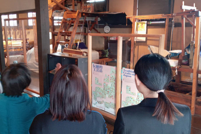 現在、多くの博多織製品は機械織によるものですが、当館では博多織の職人による手織の実演をご覧いただいています。また、機織りの体験をすることもできます。